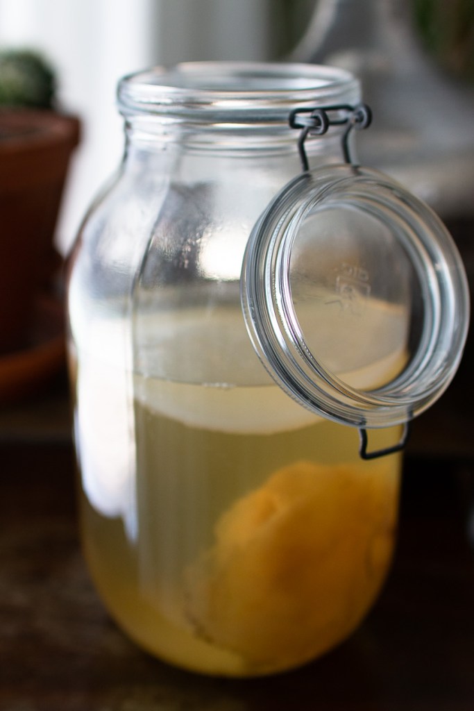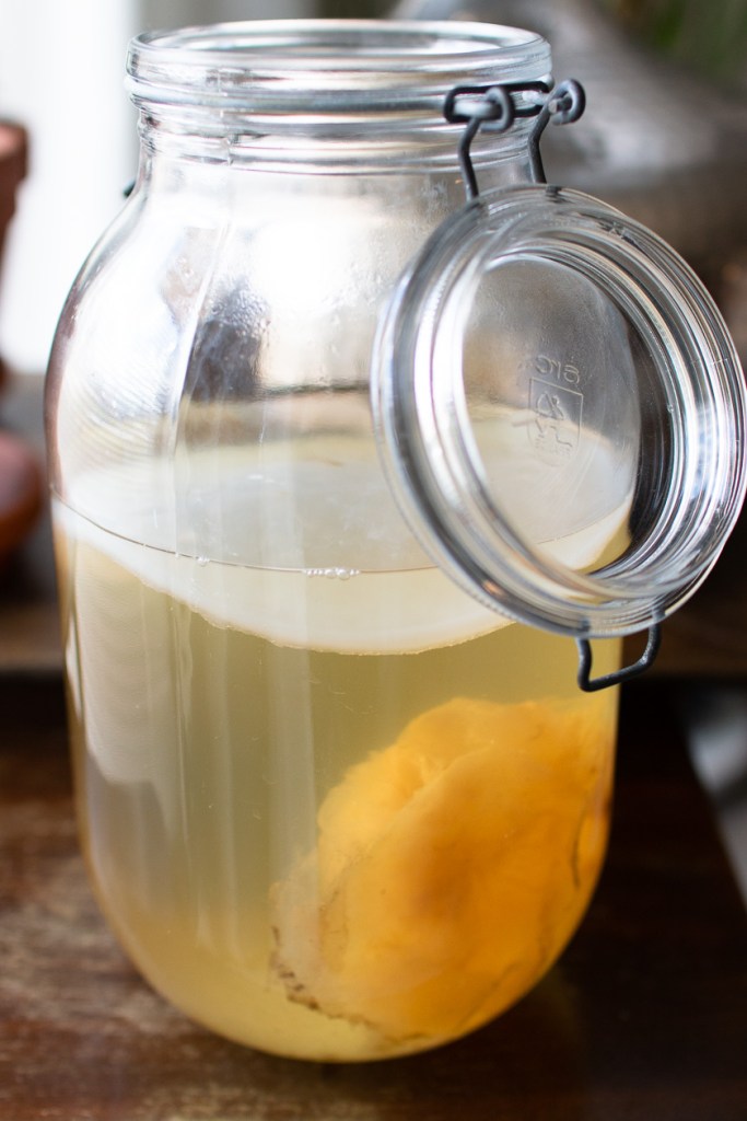- Lisää scoby ja 2 dl sen säilytysnestettä astiaan (starter)