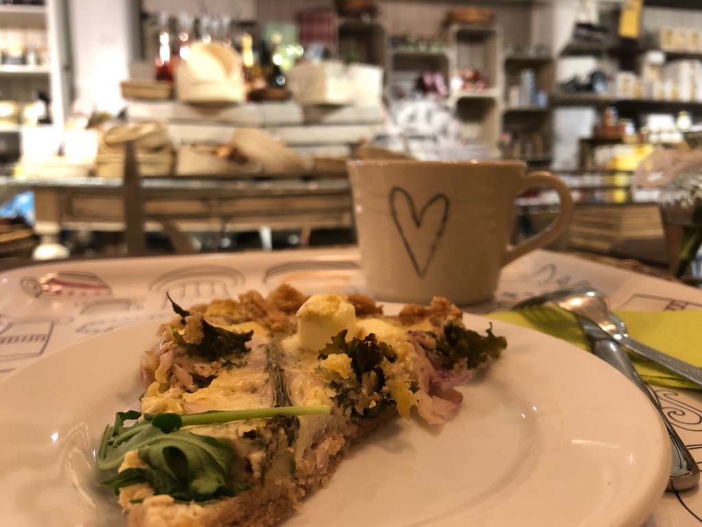 Kahvila on pieni, mutta vitriini saa kuolan valumaan. Tarjolla on usein ainakin ihanaa porkkanakakkua ja suolaisia piiraita. Tarjonta rakentuu pitkälti satokauden mukaan, mistä tykkään erityisesti.