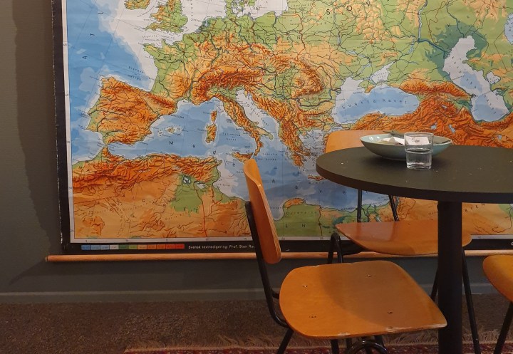 Lounastin ala-asteen tuoleilla Euroopan kartan alla, vaikka mieli olisi tehnyt sinne mustalle puolelle. Ehkä käyn ne kahvit nauttimassa vielä loman aikana siellä.